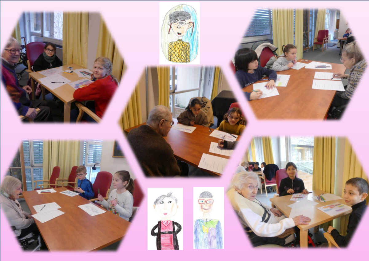 Lors de la première rencontre mensuelle, enfants et résidents ont fait connaissance à travers des jeux ludiques. Les enfants ont ensuite créé des portraits des résidents, offrant un moment chaleureux, spontané et riche en échanges.