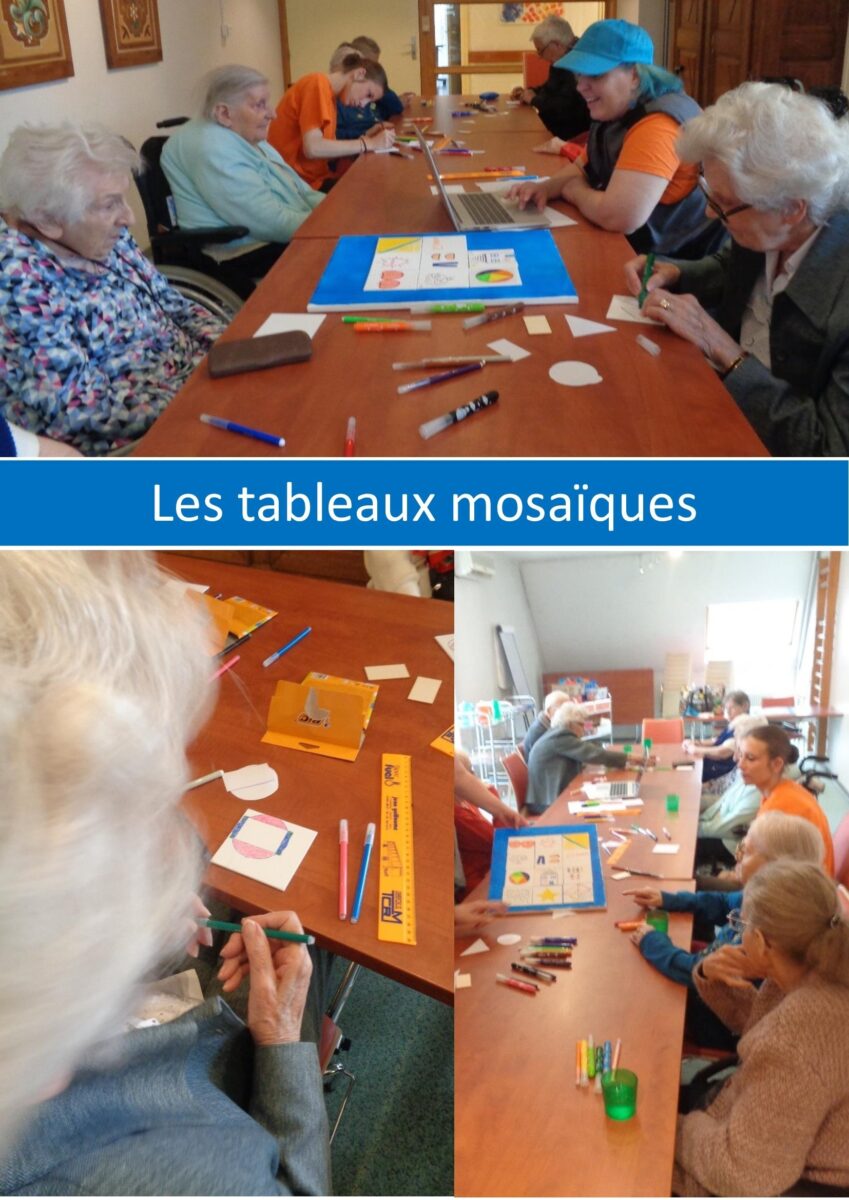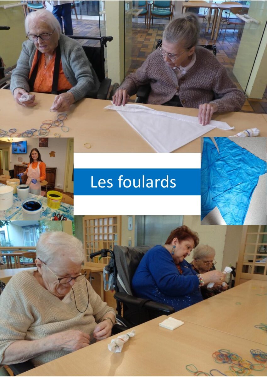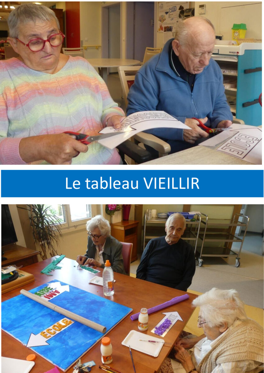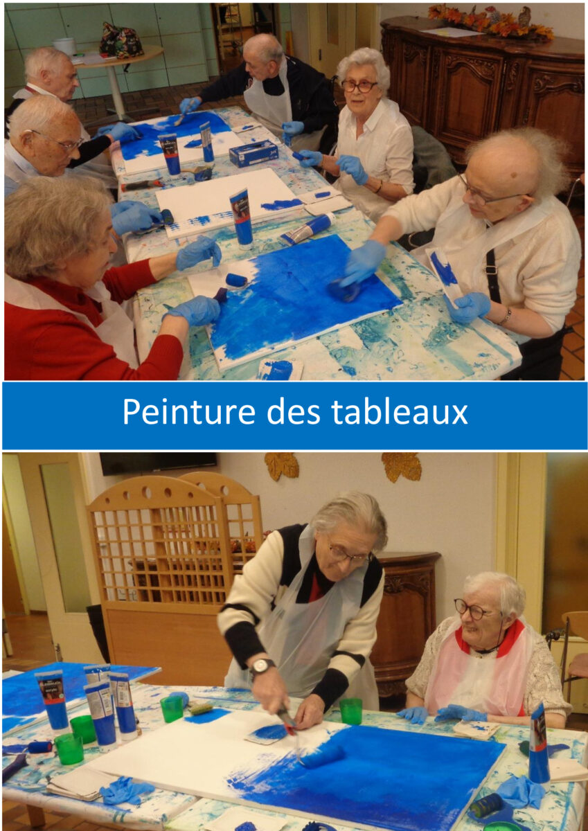 La couleur bleue, symbole de la Semaine Bleue, a inspiré des créations artistiques : tableaux, panneau directionnel et une œuvre illustrant le titre de l’exposition « Vieillir, une force à partager ». Les résidents ont également réalisé une fresque symbolisant leur vie passée et présente, ainsi que des foulards bleus, signe de leur engagement.
