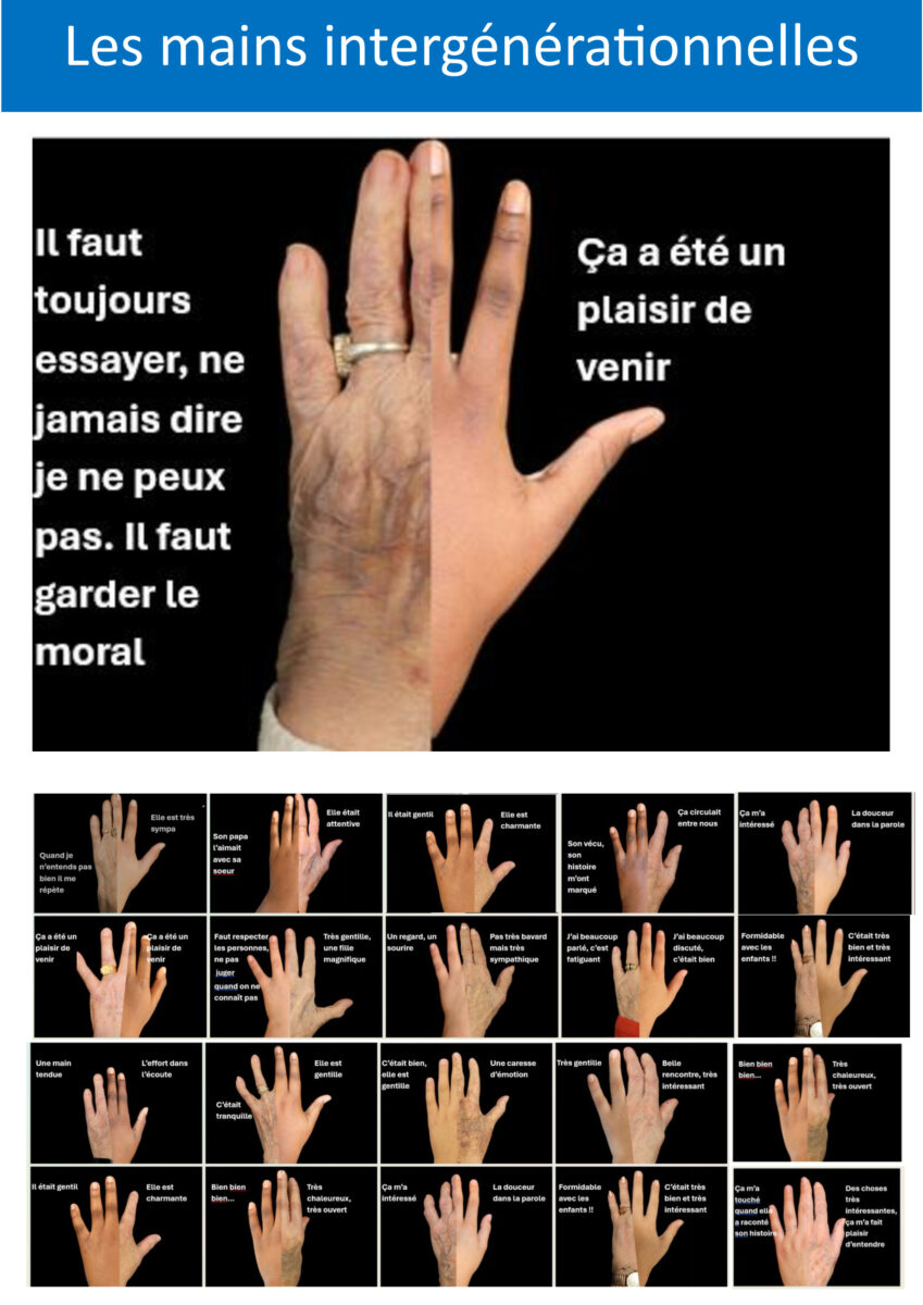 Un temps fort fut l’après-midi d’échanges avec les enfants de l’association Les Disciples. Les questions posées aux résidents ont donné lieu à des discussions riches et à la création d’un montage photo de leurs mains, accompagné du récit de cette rencontre.