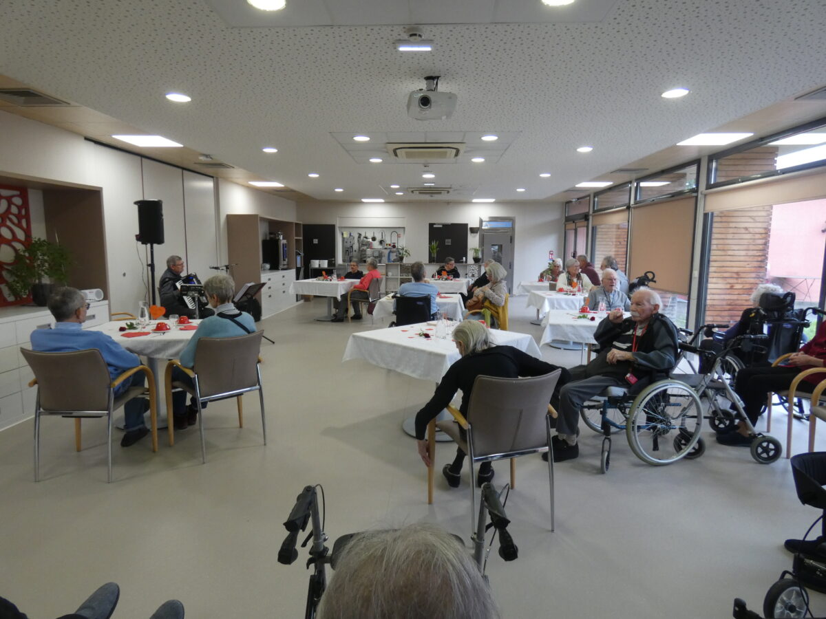 À l’approche de la Saint-Valentin, les couples de l’établissement ont bénéficié d’un moment privilégié avec un goûter festif accompagné de musique à l’accordéon, interprétée par Christian.